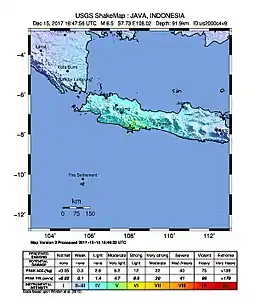 The 2017 Java earthquake occurred on 15 December 2017 when a moment magnitude 6.5 earthquake struck the Indonesian island of Java, specifically the city of Tasikmalaya on 23:47:58 West Indonesian Time (16:47:58 UTC) in West Java, Indonesia. The earthquake struck at a depth of 91 km and was categorized as a strong but deep earthquake.[2] It was initially registered as a 7.3 magnitude earthquake by Indonesian agencies. Widespread damages have been reported across Tasikmalaya, the nearest major city to the epicentre. A tsunami warning was immediately issued by the authorities but was subsequently cancelled.[3] Four people have been confirmed dead.[4]