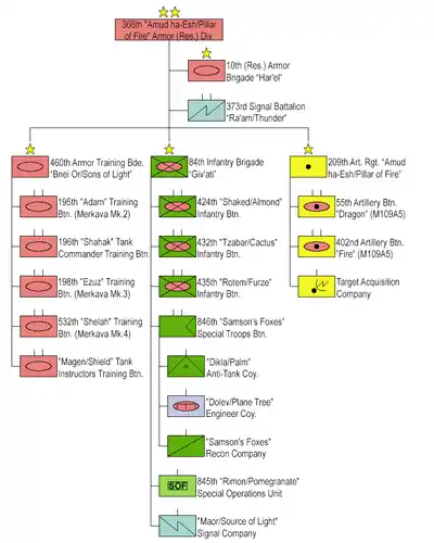 The Israel Defense Forces 366th (Reserve) Armored Division, also known as the "Path of Fire" (Hebrew: נתיב האש, Netiv Ha-Esh) Division, was a reserve armored division of the IDF. It was subordinate to the Northern Regional Command until January 2014, when the units of the division were used to create the 210th "Bashan" (Territorial) Division.