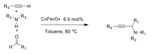 The reaction proceeds via direct dehydrative condensation[3] and requires a metal catalyst, typically based on ruthenium/copper, gold or silver.[3] Chiral catalyst can be used to give an enantioselective reaction, yielding a chiral amine. The solvent can be water.[3] In the catalytic cycle the metal activates the alkyne to a metal acetylide, the amine and aldehyde combine to form an imine which then reacts with the acetylide in a nucleophilic addition.[3] The reaction type was independently reported by three research groups in 2001 -2002;[6][7][8] one report on a similar reaction dates back to 1953.[9][10]