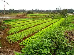 The word agriculture is a late Middle English adaptation of Latin agricultūra, from ager 'field' and cultūra 'cultivation' or 'growing'.[3] While agriculture usually refers to human activities, certain species of ant,[4][5] termite and beetle have been cultivating crops for up to 60 million years.[6] Agriculture is defined with varying scopes, in its broadest sense using natural resources to "produce commodities which maintain life, including food, fiber, forest products, horticultural crops, and their related services".[7] Thus defined, it includes arable farming, horticulture, animal husbandry and forestry, but horticulture and forestry are in practice often excluded.[7] It may also be broadly decomposed into plant agriculture, which concerns the cultivation of useful plants,[8] and animal agriculture, the production of agricultural animals.[9]