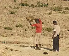 The development of agriculture enabled the human population to grow many times larger than could be sustained by hunting and gathering.[12] Agriculture began independently in different parts of the globe,[13] and included a diverse range of taxa, in at least 11 separate centers of origin.[10] Wild grains were collected and eaten from at least 105,000 years ago.[14] From around 23,000 years ago, the eight Neolithic founder crops, emmer and einkorn wheat, hulled barley, peas, lentils, bitter vetch, chick peas and flax were cultivated in the Levant.[15][16] Rice was domesticated in China between 11,500 and 6,200 BC with the earliest known cultivation from 5,700 BC,[17] followed by mung, soy and azuki beans. Sheep were domesticated in Mesopotamia between 13,000 and 11,000 years ago.[18] Cattle were domesticated from the wild aurochs in the areas of modern Turkey and Pakistan some 10,500 years ago.[19] Pig production emerged in Eurasia, including Europe, East Asia and Southwest Asia,[20] where wild boar were first domesticated about 10,500 years ago.[21] In the Andes of South America, the potato was domesticated between 10,000 and 7,000 years ago, along with beans, coca, llamas, alpacas, and guinea pigs. Sugarcane and some root vegetables were domesticated in New Guinea around 9,000 years ago. Sorghum was domesticated in the Sahel region of Africa by 7,000 years ago. Cotton was domesticated in Peru by 5,600 years ago,[22] and was independently domesticated in Eurasia. In Mesoamerica, wild teosinte was bred into maize by 6,000 years ago.[23] Scholars have offered multiple hypotheses to explain the historical origins of agriculture. Studies of the transition from hunter-gatherer to agricultural societies indicate an initial period of intensification and increasing sedentism; examples are the Natufian culture in the Levant, and the Early Chinese Neolithic in China. Then, wild stands that had previously been harvested started to be planted, and gradually came to be domesticated.[24][25][26]