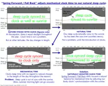 Experts in circadian rhythms and sleep are warning about the negative health implications of DST. DST cuts on sleep and causes an increased mismatch between the body clock and local time, a condition called social jetlag. Both sleep deprivation and social jetlag have been associated with negative effects on physical and mental health outcomes, including increased risks for diabetes, obesity, heart disease, depression, and some forms of cancer.[1][2][59] Year-round standard time (not year-round DST) is proposed to be the preferred option for public health and safety.[60][61][62][63][64]