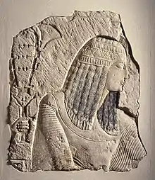 Egyptian society was highly stratified, and social status was expressly displayed. Farmers made up the bulk of the population, but agricultural produce was owned directly by the state, temple, or noble family that owned the land.[77] Farmers were also subject to a labor tax and were required to work on irrigation or construction projects in a corvée system.[78] Artists and craftsmen were of higher status than farmers, but they were also under state control, working in the shops attached to the temples and paid directly from the state treasury. Scribes and officials formed the upper class in ancient Egypt, known as the "white kilt class" in reference to the bleached linen garments that served as a mark of their rank.[79] The upper class prominently displayed their social status in art and literature. Below the nobility were the priests, physicians, and engineers with specialized training in their field. It is unclear whether slavery as understood today existed in ancient Egypt; there is difference of opinions among authors.[80]
