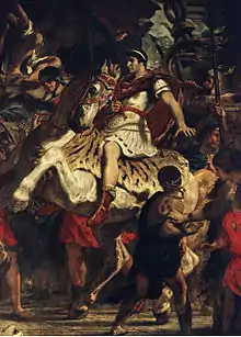 In the 4th century BC, Rome had come under attack by the Gauls, who now extended their power in the Italian peninsula beyond the Po Valley and through Etruria. On 16 July 390 BC, a Gallic army under the leadership of tribal chieftain Brennus, met the Romans on the banks of the Allia River ten miles north of Rome. Brennus defeated the Romans, and the Gauls marched to Rome. Most Romans had fled the city, but some barricaded themselves upon the Capitoline Hill for a last stand. The Gauls looted and burned the city, then laid siege to the Capitoline Hill. The siege lasted seven months. The Gauls then agreed to give the Romans peace in exchange for 1000 pounds of gold.[28] According to later legend, the Roman supervising the weighing noticed that the Gauls were using false scales. The Romans then took up arms and defeated the Gauls. Their victorious general Camillus remarked "With iron, not with gold, Rome buys her freedom."[29]