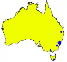 The dwarf apple is found only in the Sydney Basin, as far south as O’Hares Creek off the Georges River, on dry sandstone soils low in nutrients. The associated plant communities are heath, scrubland or open woodland, with such species as scribbly gums (Eucalyptus racemosa and E. haemastoma), red bloodwood (Corymbia gummifera), narrow-leaved apple (Angophora bakeri) heath banksia (Banksia ericifolia), rusty banksia (B. oblongifolia), silver banksia (B. marginata), conesticks (Petrophile pulchella), scrub sheoak (Allocasuarina distyla), wax flower (Eriostemon australasius) and parrot pea (Dillwynia floribunda).[5] It grows from sea level to an altitude of 300 m (1000 ft) and with an annual rainfall of 800 to 1600 mm (30 to 60 in).[5]