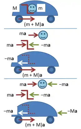 Center panel: an exploded view in the inertial frame. The passenger is subject to the accelerating force ma. The seat (assumed of negligible mass) is compressed between the reaction force –ma and the applied force from the car ma. The car is subject to the net acceleration force Ma that is the difference between the applied force (m + M)a from the axle and the reaction from the seat −ma.