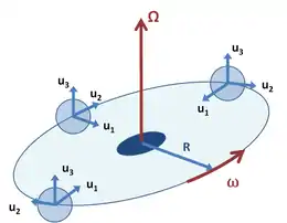 As a combination example, Figure 4 shows a coordinate system B that orbits inertial frame A as in Figure 3, but the coordinate axes in frame B turn so unit vector u1 always points toward the center of rotation. This example might apply to a test tube in a centrifuge, where vector u1 points along the axis of the tube toward its opening at its top. It also resembles the Earth-Moon system, where the Moon always presents the same face to the Earth.[35] In this example, unit vector u3 retains a fixed orientation, while vectors u1, u2 rotate at the same rate as the origin of coordinates. That is,