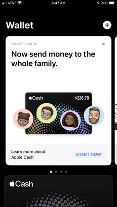![]() The Wallet app in iOS 14, with Apple Pay Cash and cards configured | |