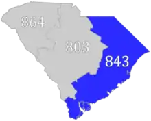 Area codes 843 and 854 are telephone area codes in the North American Numbering Plan (NANP) for that portion of the U.S. state of South Carolina comprising roughly the eastern third and the southern tip. The numbering plan area (NPA) includes the Grand Strand, the Lowcountry, the Pee Dee, and the Sandhills. Major cities in the region are Myrtle Beach, Charleston, Beaufort, Hilton Head Island and Florence. Area code 843 was created in 1998 when area code 803 was split, while 854 was added in 2015 to form an all-services overlay.