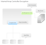 In the case of an external array controller setup, the array controller would be an independent hardware module connected to the network. Within the hardware array controller would be an Encryption unit for data encryption as well as a Key Management Client for authentication. Generally, there are few hardware array controllers to many host devices and storage disks. Therefore, it reduces deployment complexity to implement into fewer hardware components. Moreover, the lifecycle of an array controller is generally much longer than host computers and storage disks, therefore the encryption implementation will not need to be reimplemented as often as if encryption was done at another point in the storage network.
