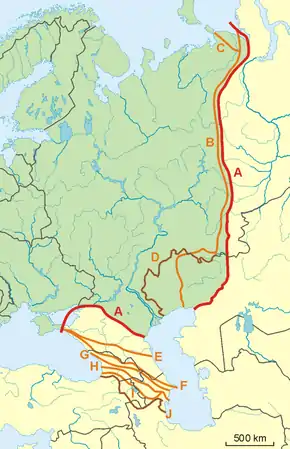 In Sweden, five years after Peter's death, in 1730 Philip Johan von Strahlenberg published a new atlas proposing the Ural Mountains as the border of Asia. Tatishchev announced that he had proposed the idea to von Strahlenberg. The latter had suggested the Emba River as the lower boundary. Over the next century various proposals were made until the Ural River prevailed in the mid-19th century. The border had been moved perforce from the Black Sea to the Caspian Sea into which the Ural River projects.[24] The border between the Black Sea and the Caspian is usually placed along the crest of the Caucasus Mountains, although it is sometimes placed further north.[23]