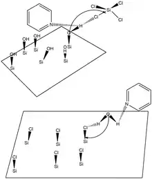 The use of catalysts is of paramount importance in delivering reliable methods of SiO2 ALD. Without catalysts, surface reactions leading to the formation of SiO2 are generally very slow and only occur at exceptionally high temperatures. Typical catalysts for SiO2 ALD include Lewis bases such as NH3 or pyridine and SiO2; ALD can also be initiated when these Lewis bases are coupled with other silicon precursors such as tetraethoxysilane (TEOS).[24] Hydrogen bonding is believed to occur between the Lewis base and the SiOH* surface species or between the H2O based reactant and the Lewis base. Oxygen becomes a stronger nucleophile when the Lewis base hydrogen bonds with the SiOH* surface species because the SiO-H bond is effectively weakened. As such, the electropositive Si atom in the SiCl4 reactant is more susceptible to nucleophilic attack. Similarly, hydrogen bonding between a Lewis base and an H2O reactant make the electronegative O in H2O a strong nucleophile that is able to attack the Si in an existing SiCl* surface species.[39] The use of a Lewis base catalyst is more or less a requirement for SiO2 ALD, as without a Lewis base catalyst, reaction temperatures must exceed 325 °C and pressures must exceed 103 torr. Generally, the most favorable temperature to perform SiO2 ALD is at 32 °C and a common deposition rate is 1.35 angstroms per binary reaction sequence. Two surface reactions for SiO2 ALD, an overall reaction, and a schematic illustrating Lewis base catalysis in SiO2 ALD are provided below.