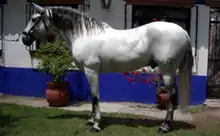 The three foundation breeds of the Azteca are the Andalusian (defined by the Mexican registry as either Pura Raza Española or Lusitano), American Quarter Horse, and Mexican Criollo or Criollo militar.[1] They were chosen to produce a breed that combined athletic ability with a good temperament and certain physical characteristics. Azteca stallions and geldings measure between 15 and 16.1 hands (60 and 65 inches, 152 and 165 cm) at the withers, while mares stand between 14.3 and 16 hands (59 and 64 inches, 150 and 163 cm).[2] The ideal height is 14.3–15.1 hands (59–61 inches, 150–155 cm).[3] Both sexes usually weigh from 1,000 to 1,200 pounds (450 to 540 kg). The facial profile of the breed is straight or convex and the neck slightly arched. Overall, they are well-muscled horses, with broad croup and chest, as well as long, sloping shoulders.[4] Gaits are free and mobile, with natural collection derived from the Andalusian ancestry of the breed.[5] The breed is found in all solid colors, although gray is most often seen. White markings are allowed on the face and lower legs by breed associations.[4] The American Azteca registry also allows non-solid pinto coloration.[5]