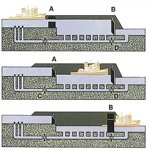 When the water pressure is equal on both sides of the gate, the lower gates (B) are opened, allowing the vessels to leave the lock chamber.[2]: 2