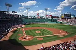 Fenway Park, home of the Boston Red Sox. The Green Monster is visible beyond the playing field on the left.