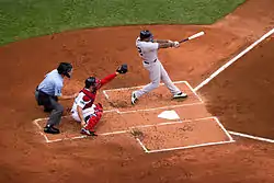 Play starts with a member of the batting team, the batter, standing in either of the two batter's boxes next to home plate, holding a bat.[12] The batter waits for the pitcher to throw a pitch (the ball) toward home plate, and attempts to hit the ball[13] with the bat.[12] The catcher catches pitches that the batter does not hit—as a result of either electing not to swing or failing to connect—and returns them to the pitcher. A batter who hits the ball into the field of play must drop the bat and begin running toward first base, at which point the player is referred to as a runner (or, until the play is over, a batter-runner). A batter-runner who reaches first base without being put out is said to be safe and is on base. A batter-runner may choose to remain at first base or attempt to advance to second base or even beyond—however far the player believes can be reached safely. A player who reaches base despite proper play by the fielders has recorded a hit. A player who reaches first base safely on a hit is credited with a single. If a player makes it to second base safely as a direct result of a hit, it is a double; third base, a triple. If the ball is hit in the air within the foul lines over the entire outfield (and outfield fence, if there is one), or otherwise safely circles all the bases, it is a home run: the batter and any runners on base may all freely circle the bases, each scoring a run. This is the most desirable result for the batter. The ultimate and most desirable result possible for a batter would be to hit a home run while all three bases are occupied or "loaded", thus scoring four runs on a single hit. This is called a grand slam. A player who reaches base due to a fielding mistake is not credited with a hit—instead, the responsible fielder is charged with an error.[12]