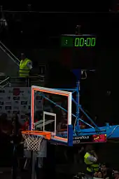 The basket is a steel rim 18 inches (46 cm) diameter with an attached net affixed to a backboard that measures 6 by 3.5 feet (1.8 by 1.1 meters) and one basket is at each end of the court. The white outlined box on the backboard is 18 inches (46 cm) high and 2 feet (61 cm) wide. At almost all levels of competition, the top of the rim is exactly 10 feet (3.05 meters) above the court and 4 feet (1.22 meters) inside the baseline. While variation is possible in the dimensions of the court and backboard, it is considered important for the basket to be of the correct height – a rim that is off by just a few inches can have an adverse effect on shooting. The net must "check the ball momentarily as it passes through the basket" to aid the visual confirmation that the ball went through.[53] The act of checking the ball has the further advantage of slowing down the ball so the rebound doesn't go as far.[54]