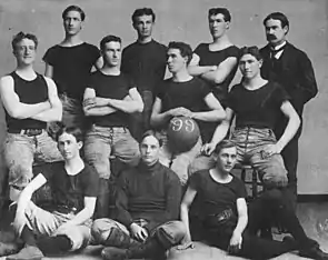 James Naismith was instrumental in establishing college basketball. His colleague C. O. Beamis fielded the first college basketball team just a year after the Springfield YMCA game at the suburban Pittsburgh Geneva College.[14] Naismith himself later coached at the University of Kansas for six years, before handing the reins to renowned coach Forrest "Phog" Allen. Naismith's disciple Amos Alonzo Stagg brought basketball to the University of Chicago, while Adolph Rupp, a student of Naismith's at Kansas, enjoyed great success as coach at the University of Kentucky. On February 9, 1895, the first intercollegiate 5-on-5 game was played at Hamline University between Hamline and the School of Agriculture, which was affiliated with the University of Minnesota.[15][16][17] The School of Agriculture won in a 9–3 game.