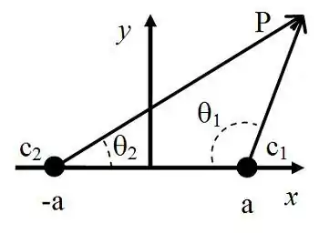 In mathematics, biangular coordinates are a coordinate system for the plane where and are two fixed points, and the position of a point P not on the line is determined by the angles and