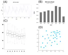 In the bar chart example, we have the birth rate in Brazil for the December months from 2010 to 2016.[8] The sharp fall in December 2016 reflects the outbreak of Zika virus in the birth rate in Brazil.