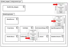 The simulation system is discretized in layers, each with its own features and requirements. Such layers are the Model Layer (ModL), where fine granularity models are implemented as discrete units,[54] the Composition Layer (CompL), where basic models are linked into more complex, aggregated models, and the Configuration Layer (ConfL), which allows providing context specific parameterization (in the software sense) for operational use. Applications can span from simple console applications to user-interacting applications based on the model-view-controller pattern, in the simplest cases linking either directly to either the ModL or the CompL, or accessing model ConfL. In all cases, the component oriented architecture allows implementing a set of functionalities which impact on the richness of functionality of the system and on its transparency. Layers implement no top-down dependency among them, hence facilitating the independent reuse of tools, utilities, and model components in different applications and frameworks.