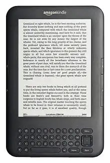 In the 2000s, due to the rise in availability of affordable handheld computing devices, the opportunity to share texts through electronic means became an appealing option for media publishers.[31] Thus, the "ebook" was made. The term ebook is a contraction of "electronic book"; it refers to a book-length publication in digital form.[32] An ebook is usually made available through the internet, but also on CD-ROM and other forms. Ebooks may be read either via a computing device with an LED display such as a traditional computer, a smartphone or a tablet computer; or by means of a portable e-ink display device known as an ebook reader, such as the Sony Reader, Barnes & Noble Nook, Kobo eReader, or the Amazon Kindle. Ebook readers attempt to mimic the experience of reading a print book by using this technology, since the displays on ebook readers are much less reflective.
