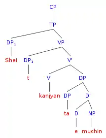 If a pronoun has a quantified expression as antecedent, the pronoun must be c-commanded by this antecedent.[3][4] An antecedent c-commands a pronoun if, when observing the structure of the sentence, a sister of the antecedent dominates the pronoun.[5]