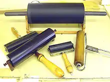 Brayers in the original sense were generally made of wood (though Southward refers to their being made of "wood or glass").[5] Later, rollers could be made of composition, vulcanized rubber, sponge, acrylic, polyurethane or leather. They are formed around a shaft or core and often attached to a wooden handle. Some rollers have an all-metal support, while larger examples may have two handles to allow for two-handed use (to allow the heavy roller to be controlled and in some cases to apply additional pressure).