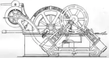 The cable-handling gear, built by Thames Iron Works and designed by W. B. Esson,[5] could also double as a paying-out machine for cable-laying work. In this mode the winch was taken out of gear and controlled with the brake. The cable sheave was mounted on a boom on the bow.[6] The same cable-handling gear was fitted to several other cable ships, but the Alert additionally carried a steam winch to deal with the heavy portions of cable near the landing sites. Cables are more heavily protected at the shore ends because of the greater risk of damage from other ships such as fishing boats. Alert sometimes had to deal with strains up to 30 tons.[7] One of the most exposed jobs on the ship was that of the crew placing stoppers on the cable being handled. This was done from narrow footboards on the sides of the bow of the ship by men prevented from falling into the sea only by a line attached under their arms.[8]