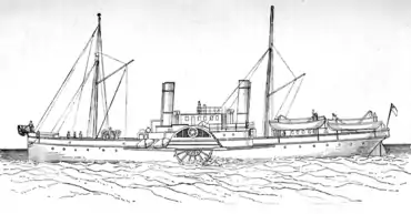 The ship was built by A. McMillan and Son of Dumbarton for the Submarine Telegraph Company, who had previously laid the first submarine cable across the English Channel. She was launched on 6 March 1871 and named The Lady Carmichael[2] after the wife of the company chairman. The ship was used for repair work in coastal waters. She was particular suitable for this because she had a shallow draught and could turn on the spot by counter-rotating her twin paddles.[3] She was able to execute a turn even quicker (though not on the spot) simply by taking one of her paddles out of gear. Reversing the paddles allowed her to stop faster than an equivalent propeller-driven ship and gave her the ability to move astern just as fast as she could move forward.[4]