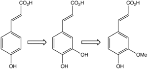 In plants, caffeic acid (middle) is formed from 4-hydroxycinnamic acid (left) and is transformed to ferulic acid.