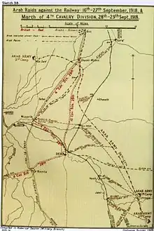 After halting for the night at Er Remte, Barrow commanding the 4th Cavalry Division ordered patrols by the 10th Brigade, to establish whether Deraa was defended. The brigade covered the assembly of the division at 04:30 on 28 September east of Er Remta before advancing at 07:00 towards Deraa. They reached Deraa during the early morning to find it occupied by Prince Feisal's Sherifial force. Contact was made with Lawrence, who informed them that Sherifial irregulars had captured Deraa the previous afternoon, and the 4th Cavalry Division entered the town.[17][27][31] Near Deraa a British airman from No. 144 Squadron who had been a prisoner of the Ottoman Empire was liberated, having managed to escape when the train he had been on collided with another train that had been derailed following a bombing on the railway.[37]