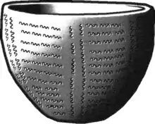 The alternative name, impressed ware, is given by some archaeologists to define this culture, because impressions can be made with sharp objects other than cockle shells, such as a nail or comb.[1] Impressed pottery is much more widespread than the Cardial.[2] Impressed ware is found in the zone "covering Italy to the Ligurian coast" as distinct from the more western Cardial extending from Provence to western Portugal. The sequence in prehistoric Europe has traditionally been supposed to start with widespread Cardial ware, and then to develop other methods of impression locally, termed "epi-Cardial". However the widespread Cardial and Impressed pattern types overlap and are now considered more likely to be contemporary.[3]