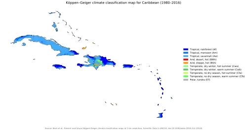 A mostly tropical geography, the climates are greatly shaped by sea temperatures and precipitation, with the hurricane season regularly leading to natural disasters. Because of its tropical climate and low-lying island geography, the Caribbean is vulnerable to a number of climate change effects, including increased storm intensity, saltwater intrusion, sea level rise and coastal erosion, and precipitation variability.[10] These weather changes will greatly change the economies of the islands, and especially the major industries of agriculture and tourism.[10]