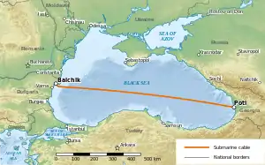 The Caucasus Cable System (unofficially also designated as the Bulgaria–Georgia communications cable) is a Georgian-owned submarine communications cable in the Black Sea linking Poti, Georgia to Balchik, Bulgaria over a distance of 1,182 km. Its landing station in Balchik is connected to Frankfurt, Germany and other European Internet hubs via terrestrial connection.[2][1] As the only communications cable linking Georgia directly to Europe, the Caucasus Cable System is deemed of geostrategic importance and has been at the center of controversy due to alleged plans to sell it to a Russian-owned company.[3] As of January 2017 the cable is still in sole ownership of Caucasus Online.[1]