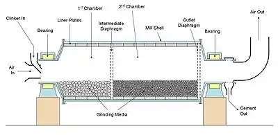 A cement mill (or finish mill in North American usage[1]) is the equipment used to grind the hard, nodular clinker from the cement kiln into the fine grey powder that is cement. Most cement is currently ground in ball mills and also vertical roller mills which are more effective than ball mills.