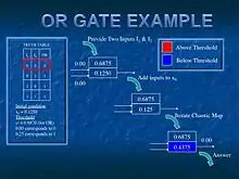 In this case, the value of x is chaotic when r >~ 3.57... and rapidly switches between different patterns in the value of x as one iterates the value of n. A simple threshold controller can control or direct the chaotic map or system to produce one of many patterns. The controller basically sets a threshold on the map such that if the iteration ("chaotic update") of the map takes on a value of x that lies above a given threshold value, x*,then the output corresponds to a 1, otherwise it corresponds to a 0. One can then reverse engineer the chaotic map to establish a lookup table of thresholds that robustly produce any of the logic gate operations.[1][2][3] Since the system is chaotic, we can then switch between various gates ("patterns") exponentially fast.