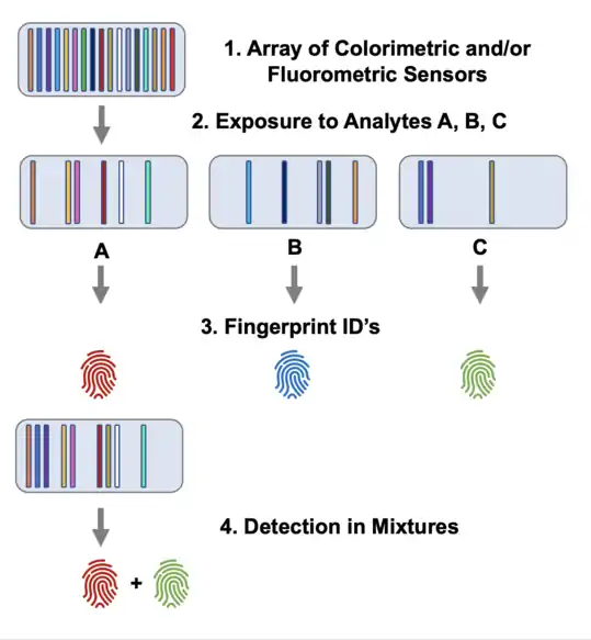 Single sensor devices sense target analytes based on physical, optical, and electronic properties. Some sensors contain specific molecular targets to afford strong and specific binding with a particular analyte; however, while this approach is specific, complex mixture impact sensor performance. Several of these complex mixtures include odors and vapors exhaled from the lungs.[1] Individual chemical sensors often utilize controlled sensing environments, and variations in ambient conditions (e.g., temperature and humidity) can interfere with sensor performance.[2][5] Chemical sensor arrays employ pattern recognition of combinatorial responses of cross-reactive sensor components to enable sensing of a diverse array of mixtures in a variety of conditions.[1][2][5][3] Chemical sensor arrays are often noted as mimicking the five senses—audition, gustation, olfaction, somatosensation, and vision—because the combinatorial responses to the different array components of a particular analytes create fingerprints for specific analytes or mixtures using both targeted molecular interactions and pattern recognition.[3][4]