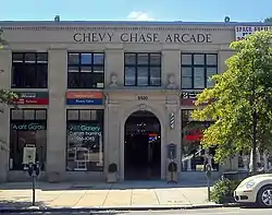 The building is a unique example of a small-scale commercial arcade in Washington.[2] Built in 1925, it is located along Chevy Chase's commercial strip, Connecticut Avenue. The area was planned by the Chevy Chase Land Company as one of four commercial areas along the street that are separated by apartment blocks. The Arcade is an example of providing elegant and convenient shopping venues in the city's prestigious suburban neighborhoods.[2]