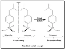 The chiral switch concept[4] is illustrated in the diagram. This chiral switch is from (±)-ibuprofen to (S)-(+)-ibuprofen (dexibuprofen). The nonsteroidal anti-inflammatory drug (NSAID) ibuprofen was the first chiral drug of the NSAID class to be switched to the single-enantiomer version in 1994. The switch was done based on the fact that the (S)-ibuprofen, the eutomer, was over 100-fold more potent as an inhibitor of cycloxygenase-1 (COX-1) enzyme than (R)-ibuprofen.[18] Moreover, ibuprofen, when administered as the racemate, the active (R)-enantiomer undergoes partial unidirectional chiral inversion (approximately 60%) to the (S)-enantiomer. Therefore, the use of the single (S)-ibuprofen was expected to give faster onset of action at a lower dosage.[19]