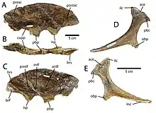 Currie and Russell also addressed the complicating issue of a possible second form being present in the material. In 1933 William Arthur Parks had named Ornithomimus elegans, based on specimen ROM 781, another foot from Alberta.[9] In 1971, Joël Cracraft, still under the assumption Caenagnathus was a bird, had named a second species of Caenagnathus: Caenagnathus sternbergi, based on specimen CMN 2690, a small lower jaw. In 1988 Russell and Currie concluded that these fossils might present a more gracile morph of Chirostenotes pergracilis. In 1989 however, Currie thought that they represented a separate smaller species, and named this as a second species of the closely related Elmisaurus: Elmisaurus elegans.[10] In 1997, this was renamed to Chirostenotes elegans by Hans-Dieter Sues.[11] The species was moved to the new genus Leptorhynchos in 2013.[12]