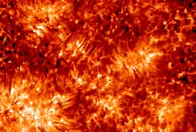 The density of the chromosphere decreases with distance from the center of the Sun. This decreases exponentially from 1017 particles per cubic centimeter, or approximately 2×10−4 kg/m3 to under 1.6×10−11 kg/m3 at the outer boundary.[2] The temperature decreases from the inner boundary at about 6,000 K[3] to a minimum of approximately 3,800 K,[4] before increasing to upwards of 35,000 K[3] at the outer boundary with the transition layer of the corona.