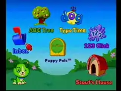 When the console is used for the first time, an adult is required to set up the user for the console. This includes the user's name, and difficulty level. Upon completion, the child is allowed to log in for the first time, in which Tad and Dot (two LeapFrog characters) will give the child a present- the puppy, Scout. Apparently the user is to babysit Scout while Tad and Dot are away. Subsequent log-ins will start with Tad and Dot coming on-screen and calling Scout into view before leaving. From here, the main menu appears and the user is given access to four built-in games, the cartridge game if its present, and Scout's dog house, in which the user can go to explore and play. Playing any of the built-in games will earn the user dog biscuits, which could be given to Scout in the dog house to have him perform tricks.