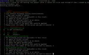 ![]() The SpaceConsistencyBear detecting tabs in files where spaces were expected using coala's terminal interface. | |