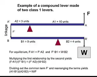 The figure on the left illustrates a compound lever formed from two first-class levers, along with a short derivation of how to compute the mechanical advantage. With the dimensions shown, the mechanical advantage, W/F can be calculated as 10/3 × 9/4 = 7.5, meaning that an applied force of 1 pound (or 1 kg) could lift a weight of 7.5 lb (or 7.5 kg).