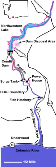 The facility consisted of Condit Dam 45°46′02″N 121°32′16″W in Klickitat County, and its impoundment, Northwestern Lake; a woodstave pipeline that transported water to a surge tank and auxiliary spillway; two penstocks; and the powerhouse. Two horizontally mounted Francis turbines and generators produced electrical power, and the exhausted water rejoined the river about a mile downstream of the dam.