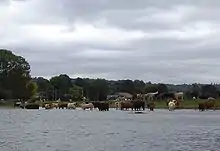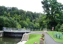 In 1832 Lord Boston of Hedsor House claimed compensation for loss of towpath rights along Hedsor Water which he was granted.[9] In 1837 a weir was found necessary and built, as a cost of £650. It doubled the fall on the lock to around 4 feet (1.2 m).[5] The construction led to further litigation from Lord Boston for loss of trade to the wharf he owned there. This time the only compensation he received was the building of a flash lock in the weir.[10] This was removed when the lock was rebuilt in 1869, as Lord Boston had built eel bucks in the stream in the meantime.[11]