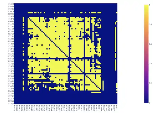 A heat map is a visual representation of a matrix of m × n that can show different phenomenons on a 2-Dimensional scale. Heat maps have a range of color intensities based on the values and scale given from the data. Coding-wise, heat maps can be created using libraries such as plotly.express in Python. Using co-segregation, heat maps are used to visualize a matrix that contains values of either 1 or 0 to visualize the commonalities between 2 or more variables. "The primary benefit of using heat maps is that they make otherwise dull or impenetrable data understandable. Many people understand heat maps intuitively, without even needing to be told that those warmer colors indicate a denser focus of interactions."[8]