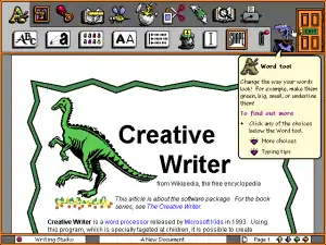 Creative Writer is a word processor released by Microsoft Kids in 1993. Using this program, which is specifically targeted at children,[1] it is possible to create documents such as letters, posters, flyers and stories complete with different fonts, Clip art, WordArt and effects. The interface and environment is especially targeted towards children and is set in Imaginopolis with the main helper being a character known as McZee.[2] A sequel, Creative Writer 2, was released in 1996. Both are now discontinued, but can still be acquired from online stores and auction websites such as eBay.