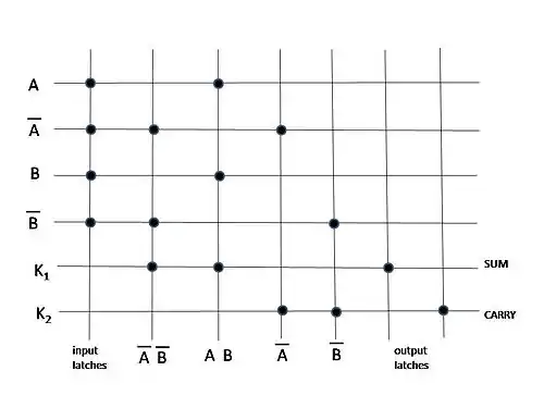 This application was developed by Greg Snider of Hewlett-Packard and employs crossbar latches to replicate the functions of a half adder, which form the basis of modern computational architectures.[4] In this application a crossbar tile is formed of a layer of horizontal row wires and a layer of vertical column wires in which memristor or similar materials are sandwiched between the horizontal and vertical wire layers. Each intersection or junction of the crossbar tile is configurable to be at a high-resistance state in which there is little or no current between the horizontal and vertical wires or at a low-resistance state in which current is permitted. Fig. 1 illustrates the configuration of a half-adder using a crossbar tile, as taught by Snider, with the nodes identifying junctions of the crossbar tile configured as low-resistance states. By setting different logic inputs A, NOT A, B, and NOT B to different row wires this configuration produces the sum and carry outputs typical for a half-adder. Connections between multiple half-adders may then be used to form full adders in accordance with conventional arithmetic architectures.